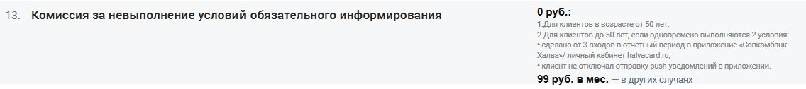 Также стоит учесть комиссию за невыполнение условий обязательного информирования которая составляет 99 рублей в месяц. Она не начисляется клиентам старше 50 лет или при выполнении двух условий:
