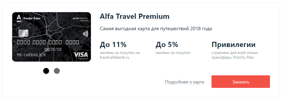 - кэшбек дают в виде миль, 5% при расходах от 100 000 руб./мес., 3% – от 70 000 руб./мес., 2% – от 10 000 руб./мес. До 11% на покупки через travel.alfabank.ru (тариф Премиум).