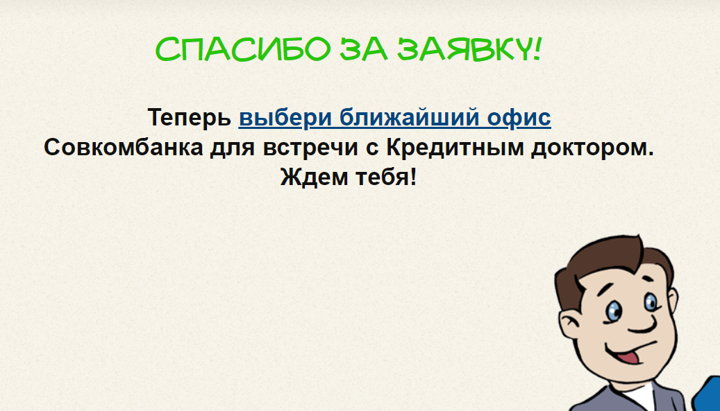 На экране появится сообщение «Спасибо за заявку» и будет предложено выбрать ближайший офис Совкомбанка для предоставления паспорта РФ и заключения договора.