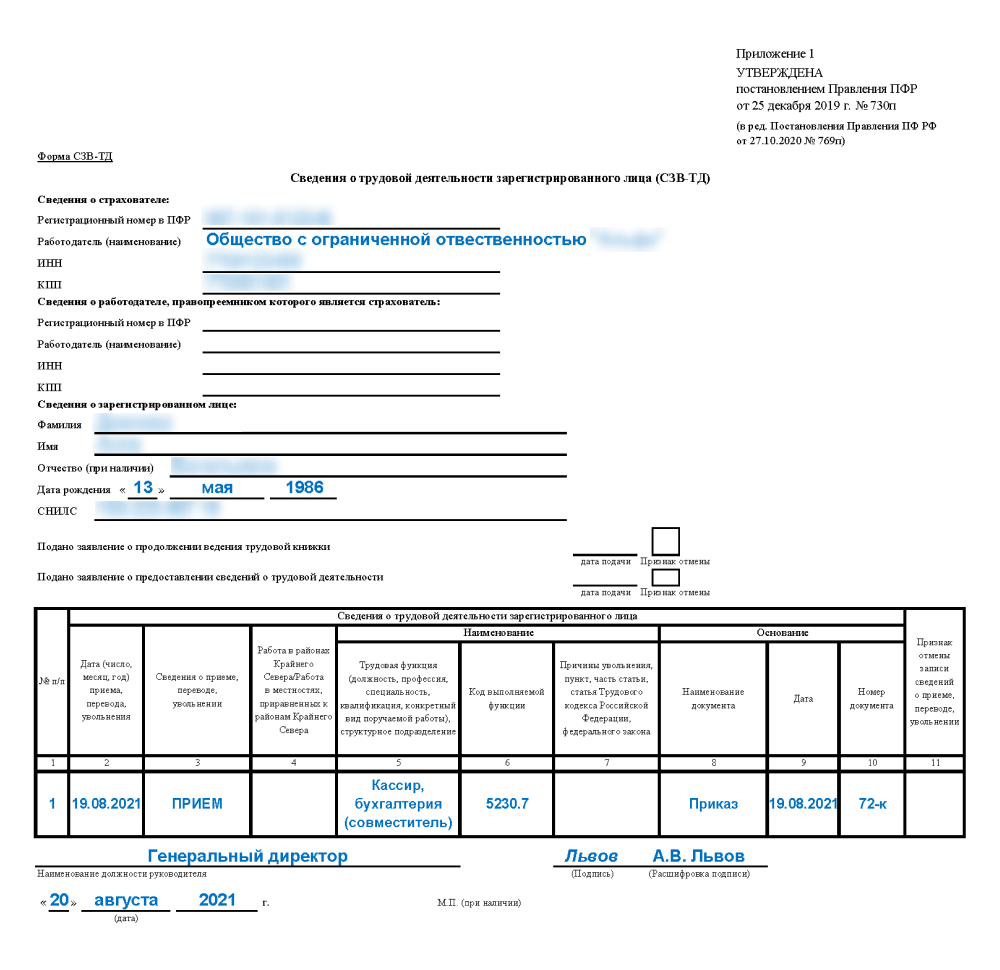 Пример формы СЗВ-ТД при трудоустройстве