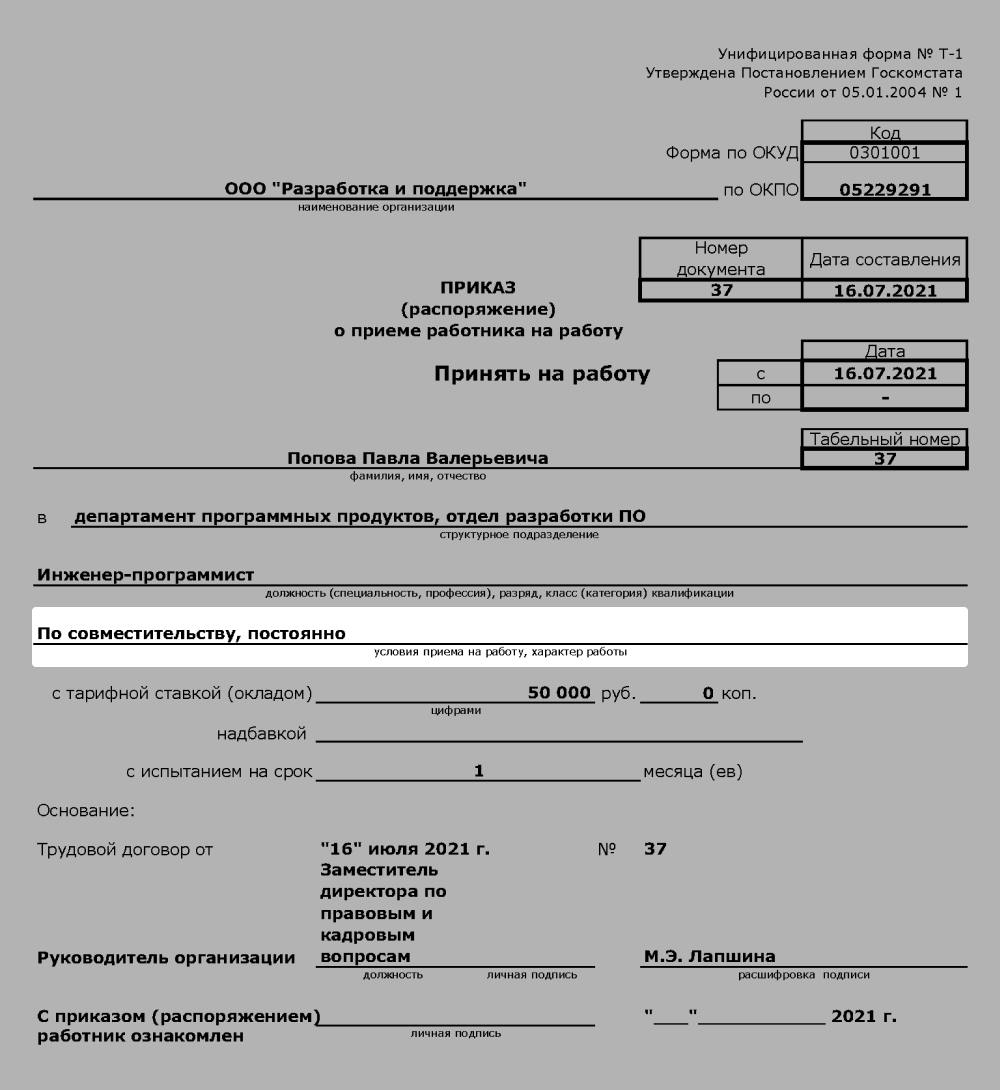 Пример приказа о приеме на работу совместителя: