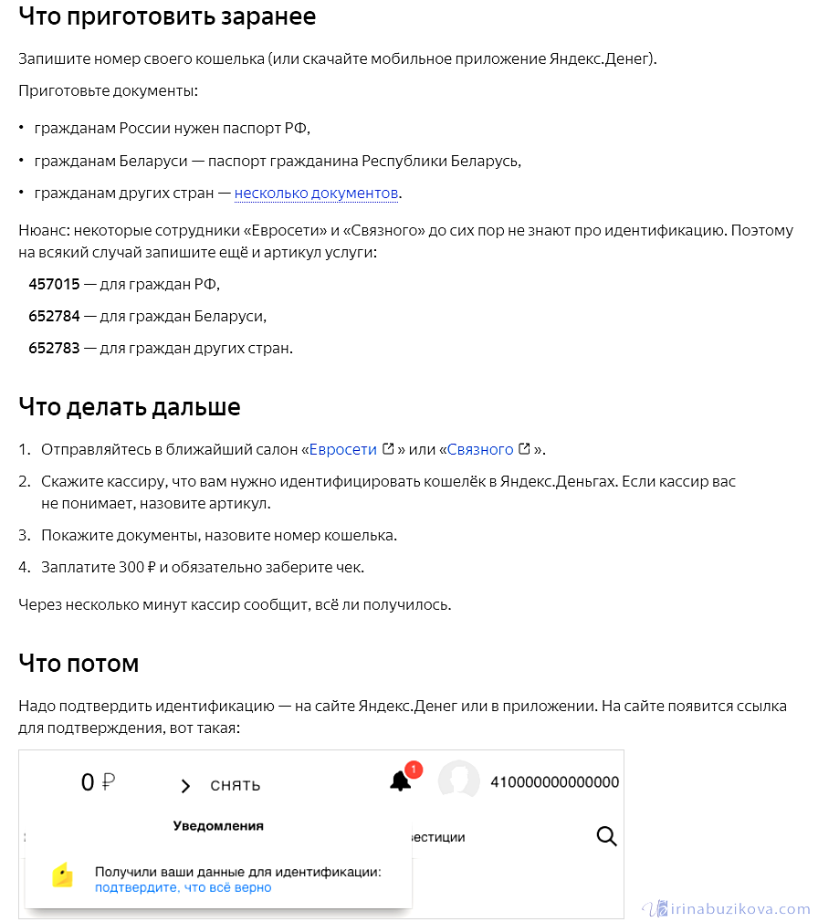 Процесс идентификации довольно сложен, если у вас нет уже идентифицированных кошельков и вам неоткуда ее скопировать. Вам необходимо заполнить заявление и подписать его от руки, после чего прийти либо в офис Яндекс.Денег (доступны в 5 крупных городах России), либо в магазин Евросеть или пункт системы Contact с паспортом. Более подробно о том, как идентифицировать свой Яндек Кошелек я расскажу в другой статье.
