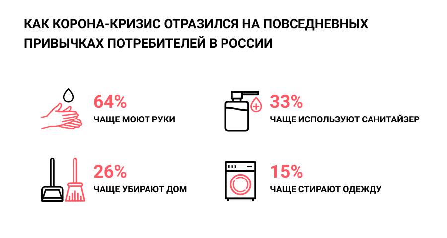 В ситуации пандемии происходит изменение иерархии ценностей потребителей, и на первый план выходит забота о здоровье. Так, в потребительском исследовании Nielsen, которое было проведено в конце марта 2020 года, 72% респондентов поставили здоровье на первое место, тогда как в середине месяца таких было 66%. Тот факт, что приоритеты людей сместились в сторону заботы о здоровье, подтверждает и значительный рост продаж порошков, средств для уборки дома, мытья посуды и чистки пола (данные продаж в крупнейших розничных сетях России собирались в течение недели с 16 по 22 марта). Согласно исследованию, 64% его участников стали чаще мыть руки, каждый третий (33%) регулярно использует санитайзеры, а более четверти (26%) чаще убираются дома.