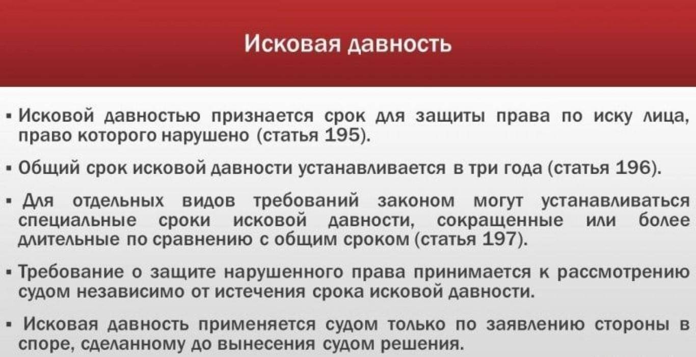 Важно: соответственно статье 200 1 части ГК РФ, исковая давность не может наступить в момент войны на территории страны и при внесении изменений в нормативные документы Гражданского Кодекса