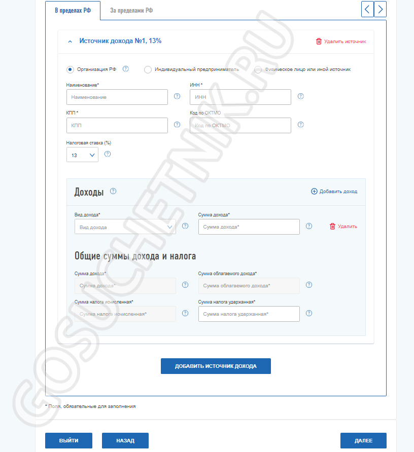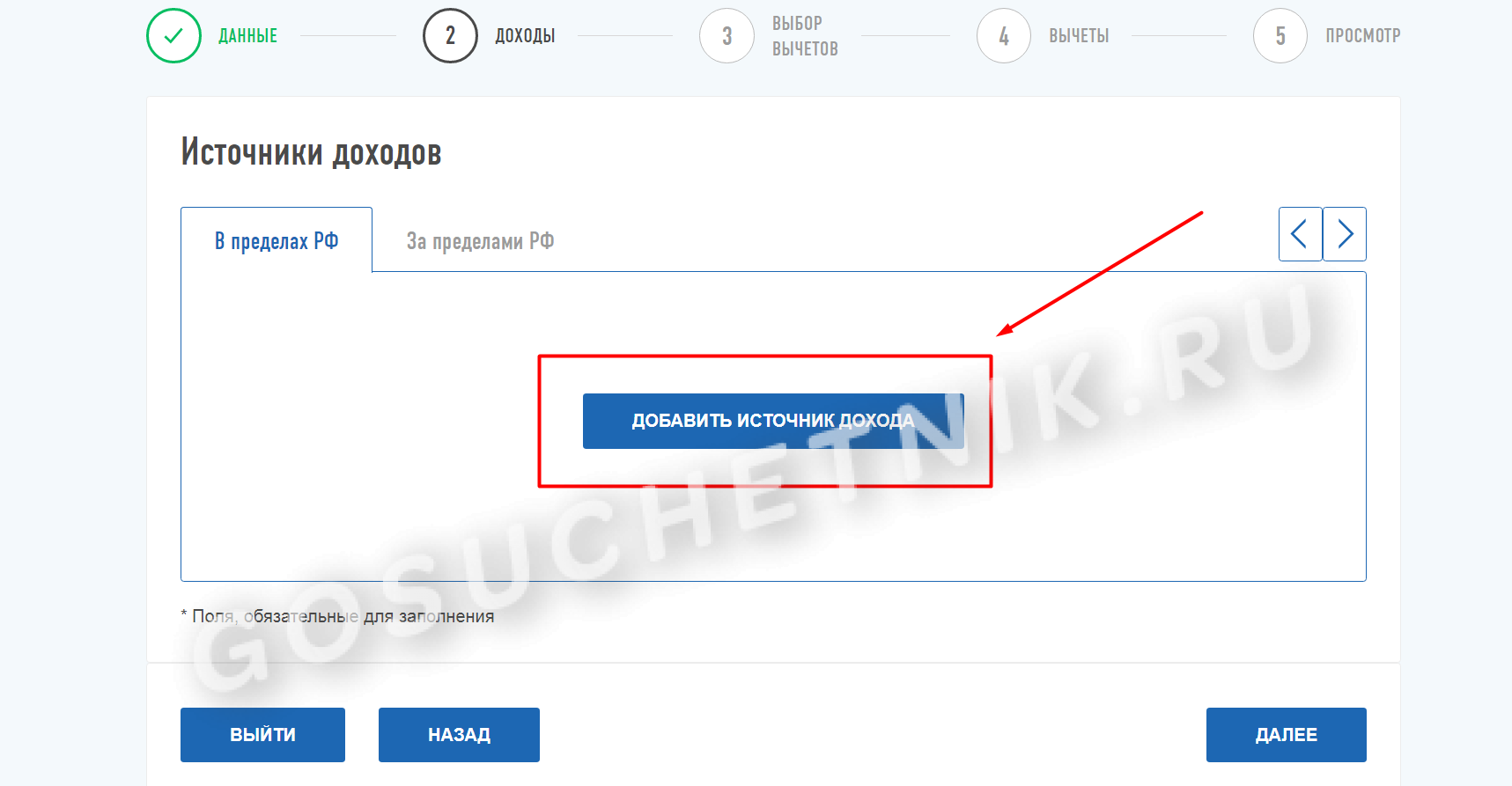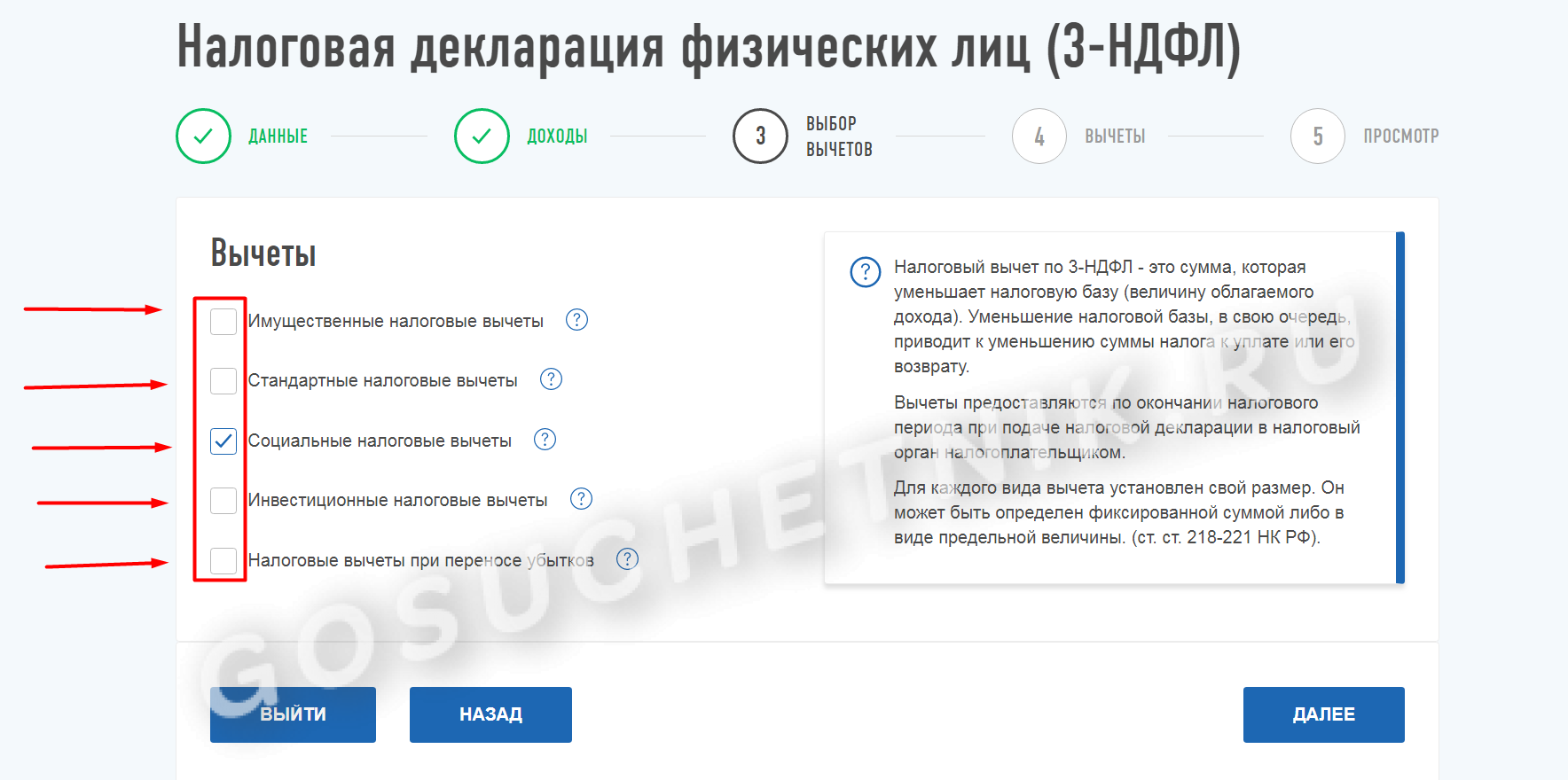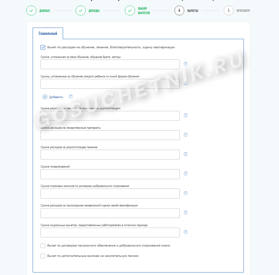 Шаг 5. Впишите информацию о полагающихся налоговых вычетах. Пользуйтесь подсказками системы. Прикрепите сканы подтверждающих документов.