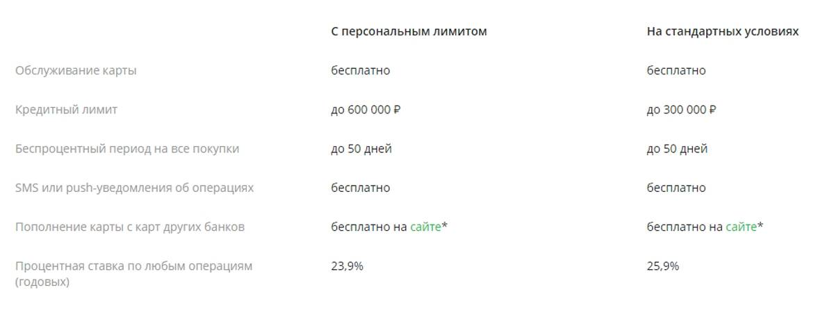 Кредитный лимит: до 600 000 рублей (для новых клиентов устанавливается лимит в 100-200 тысяч, с возможностью повышения).