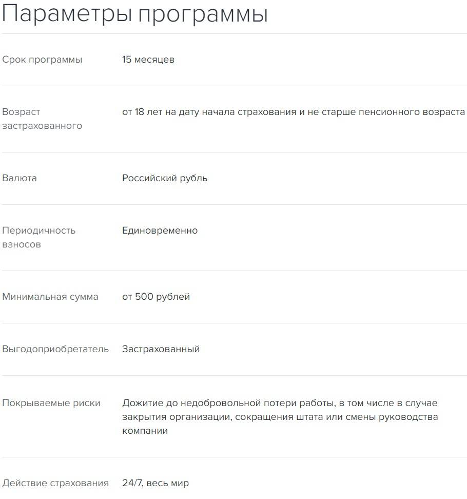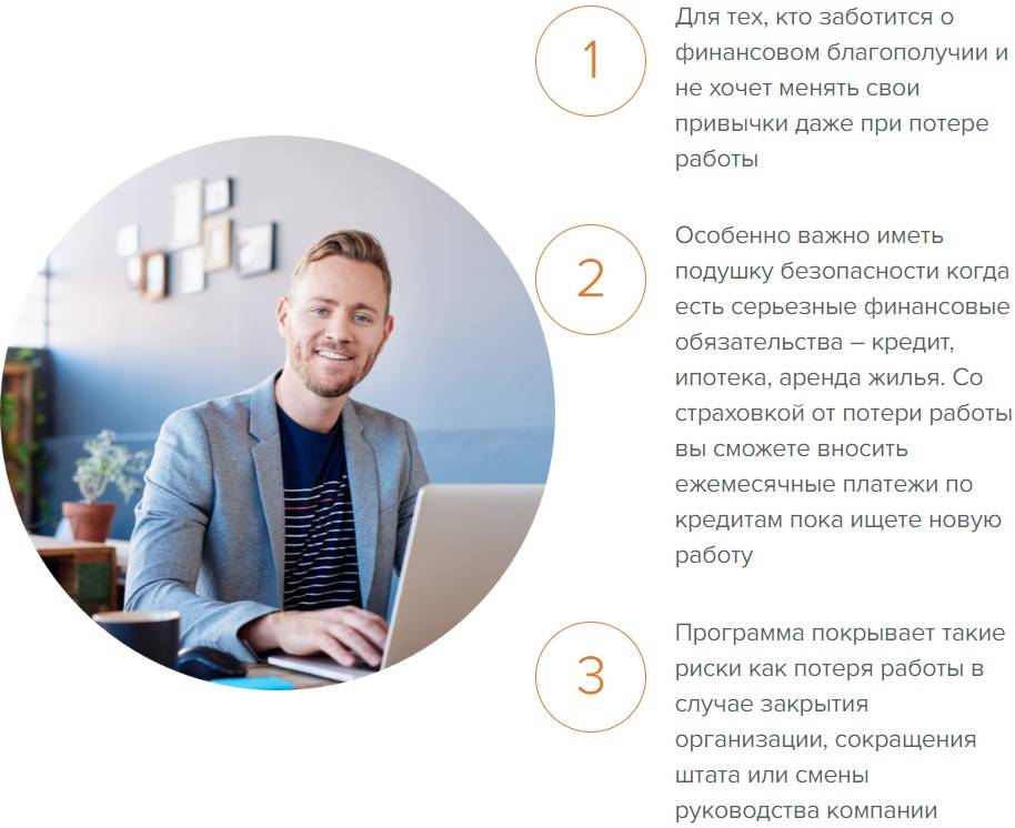 Программа «Страхование от потери работы» подходит для граждан, которые беспокоятся о своем финансовом положении и не хотят пренебрегать своими привычками в случае увольнения. Особо необходима финансовая подушка безопасности в том случае, когда имеются непогашенные кредитные задолженности или необходимо ежемесячно уплачивать арендную плату за жилье.