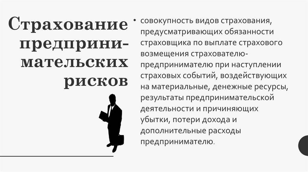 Страхование предпринимательских рисков проводится, исходя из анализа возможных негативных факторов, включает компенсацию при наступлении заранее оговоренных страховых случаев.