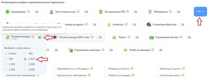 Если вы хотите застраховать отмену поездки в компании Сбер Страхование вместе с медицинским полисом этой компании, то зайдите на сайт , укажите информацию о поездке, а затем откройте «дополнительные параметры», отметьте опцию «отмена поездки» и выберите сумму покрытия из предложенных вариантов.