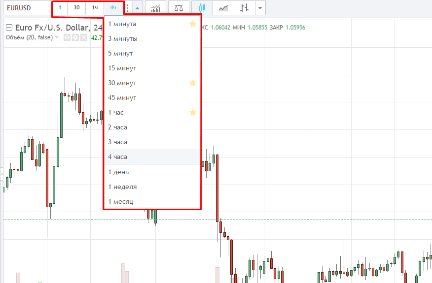 Узнать, какой таймфрейм сейчас включен можно на графике в левом верхнем углу. В данном случае открыт график с валютной парой EUR/USD c таймфреймом Н1 или один час. А значит, что каждая свеча этого графика будет формироваться один час, а не как думают многие новички, что весь график на рисунке получился за один час. В реальности его формирование (графика) длилось более суток. Если вместо свечей стоят бары, то понимание графика аналогичное.