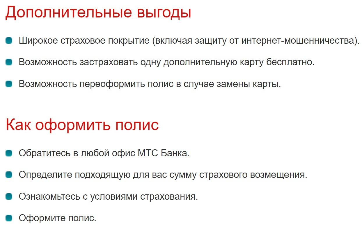 SMS-информирование платное, но очень дешевое по сравнению с аналогичной услугой других банков: всего 15 рублей в месяц. Оно подключено автоматически при получении МТС CashBack, но в первые два месяца услуга бесплатна. Также автоматически к кредитке подключена страховка, которую при желании можно легко убрать. Однако это минус, поскольку не каждый клиент сможет вовремя это заметить и самостоятельно отключить.