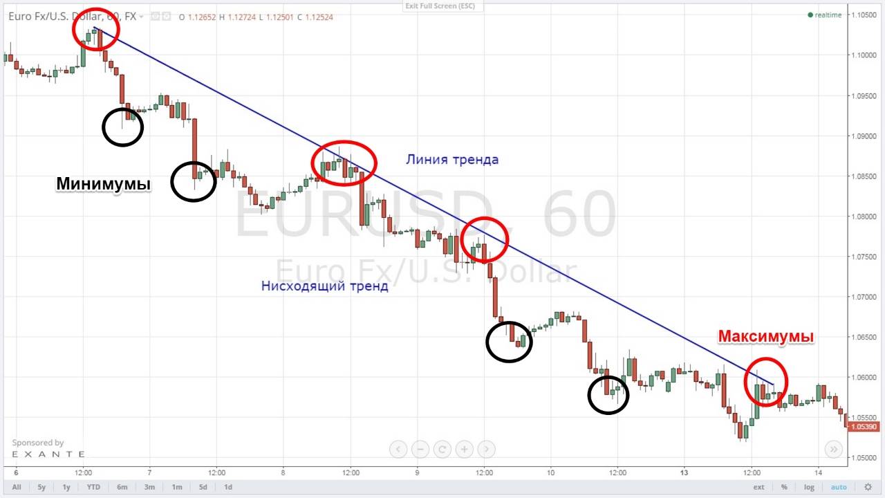 Нисходящий тренд – образуется чередованием локальных минимумов. Каждый следующий минимум обязательно должен быть ниже относительно предыдущего. Также присутствует череда максимумов, следующий из которых ниже предыдущего. Неспособность цен преодолеть предыдущий минимум, указывает на ослабление трендового движения и предупреждает о его окончании. Рост выше последнего максимума предполагает начало разворота тренда.