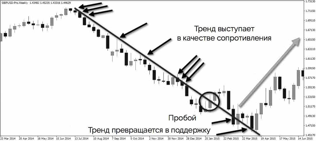 На графике изображен медвежий тренд. Стрелки на графике указывают на моменты тестирования тренда. Кружок на графике показывает момент, когда цена создает бычий пробой. Две последние стрелки в конце тренда показывают момент, когда медвежий тренд превращается из сопротивления в поддержку.