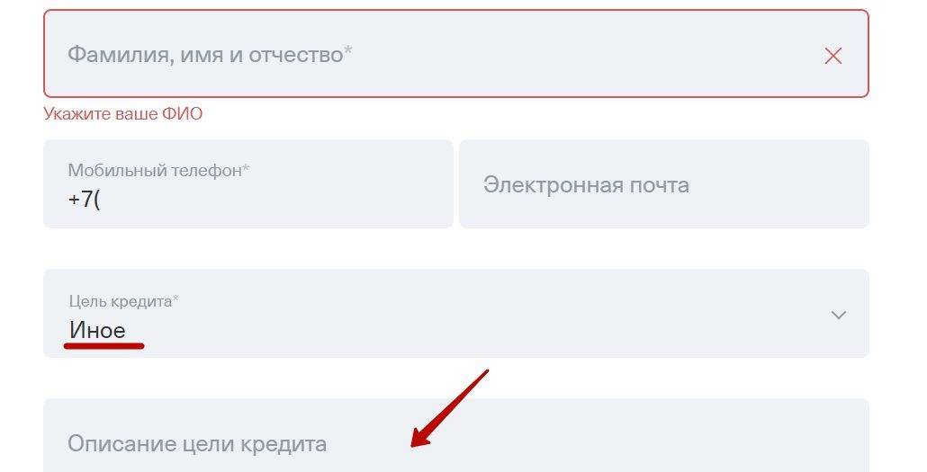 Если вы выбираете в графе вариант «Иное», программа предлагает вам еще одну графу, где можно заполнить описание цели займа.