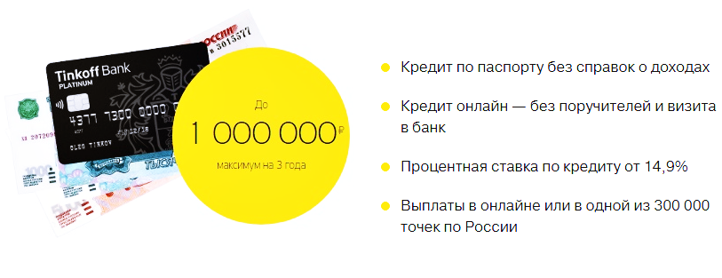 Предложение по кредитам в Тиньков выгодно отличается от других банков. Заем без залога до двух миллионов рублей можно получить под 12% и выше, срок погашения — до трех лет. Деньги выдаются без поручителей и документов, подтверждающих доход.