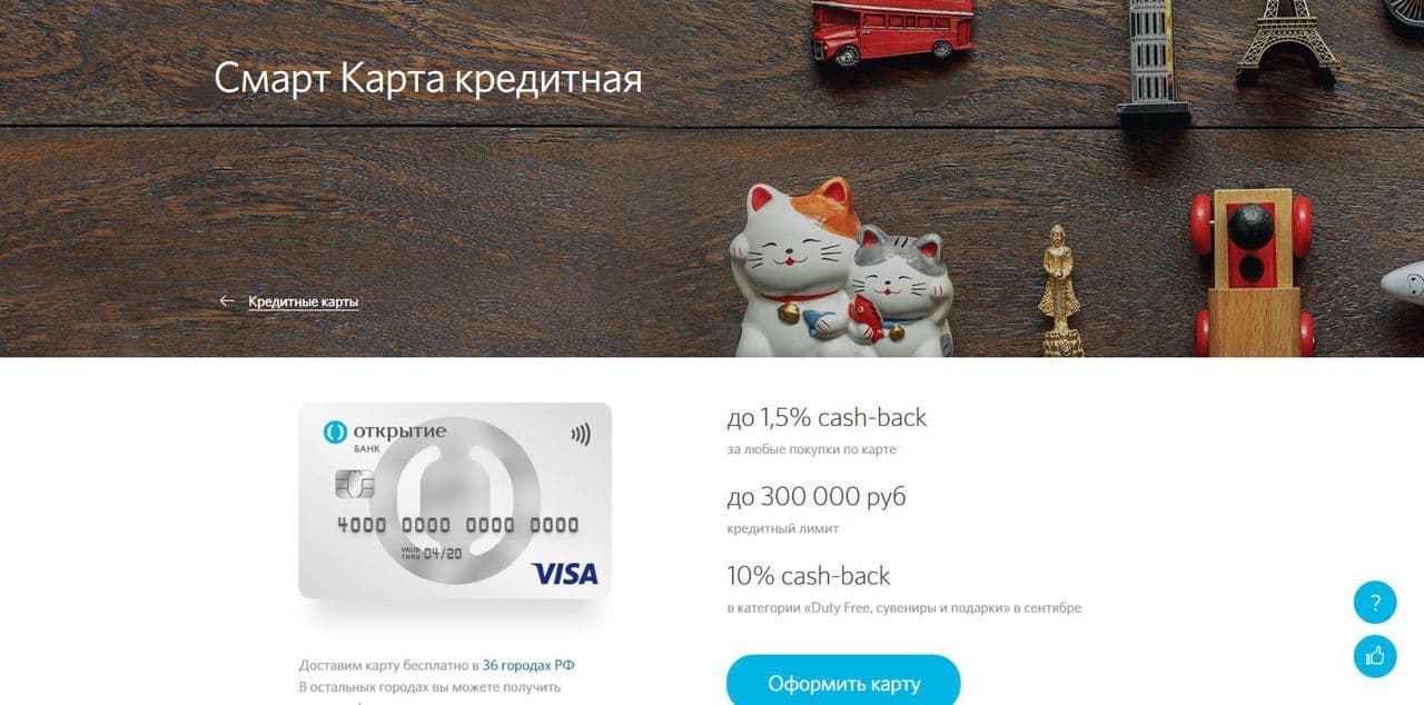 Если выполнять условия банка, можно избежать комиссий и в этом учреждении. Клиентам предлагается кредитка «Смарт» с лимитом до 300 тыс. У неё есть кэшбэк за любые покупки/в определенных категориях (они могут меняться) в размере до 1,5/10%. Стоимость обслуживания – 590 руб./год. Если владелец карты ежемесячно делает покупки до/более 30 тыс., он получает право без комиссий снимать 5/50 тыс.