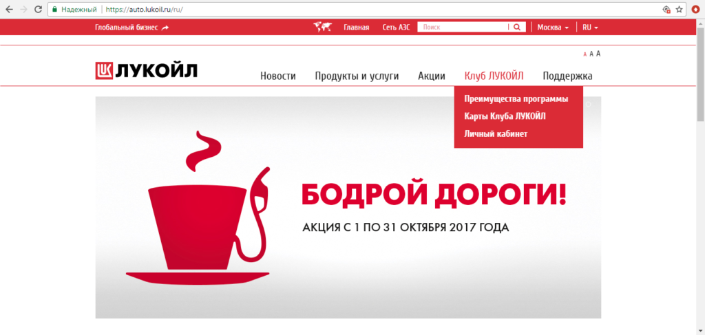 После получения карточки и заполнения договора, необходимо осуществить регистрацию. Для этого войдите на главную страницу Лукойл и в верхнем меню перейдите в раздел Клуб.