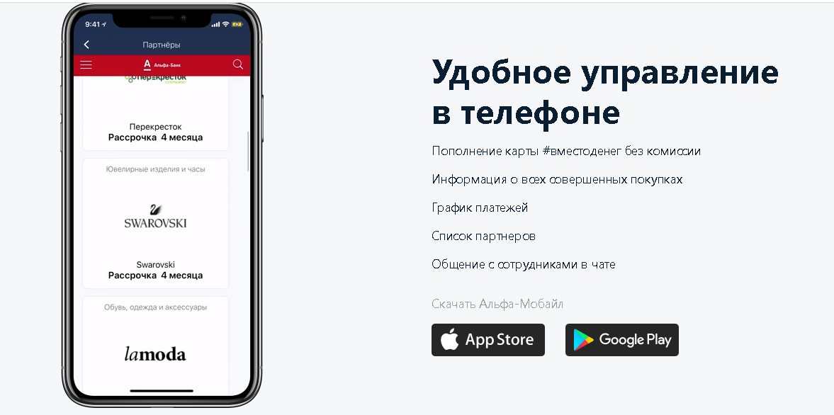 Еще одно положительное отличие карты рассрочки Альфа-Банка от аналогичных “Халва” и “Совесть ” – это возможность совершать покупки в рассрочку до 24 месяцев и в магазинах, не состоящих в партнерстве с Альфа-Банком, то есть в любых.