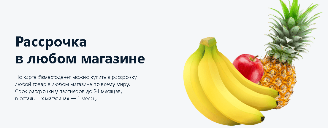 #Вместоденег стала четвертой картой рассрочки на российском рынке. По принципу действия она похожа на аналоги от других банков – Халву, Совесть и Свободу. Ее держатель может оплачивать покупки у партнеров в беспроцентную рассрочку на срок до 12 месяцев. Сумма покупки ограничена только кредитным лимитом карты.