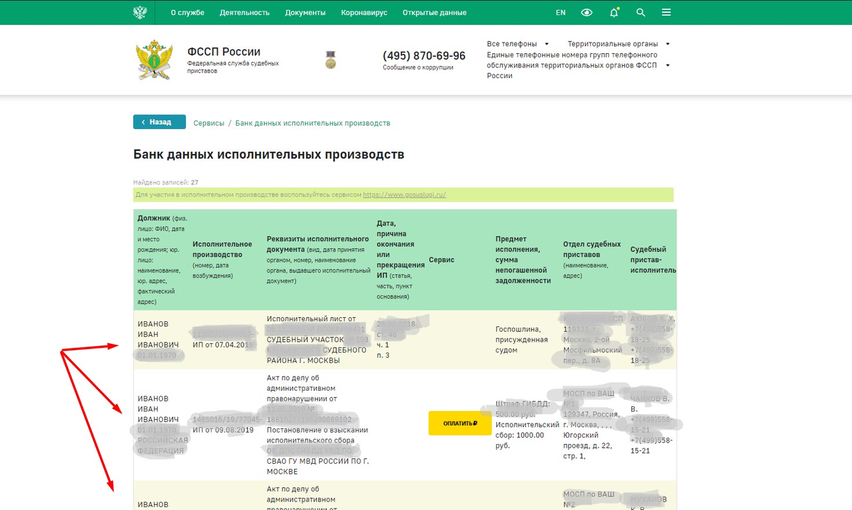 В открывшемся окне Вам нужно отыскать строчку с Вашими личными данными, в которой Вы найдёте основную информацию о имеющихся у Вас долгах.
