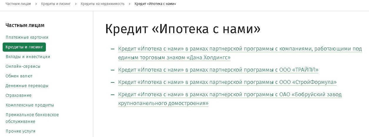 В рамках направления «кредиты на недвижимость» в Беларуcбанке представлены следующие виды программ: