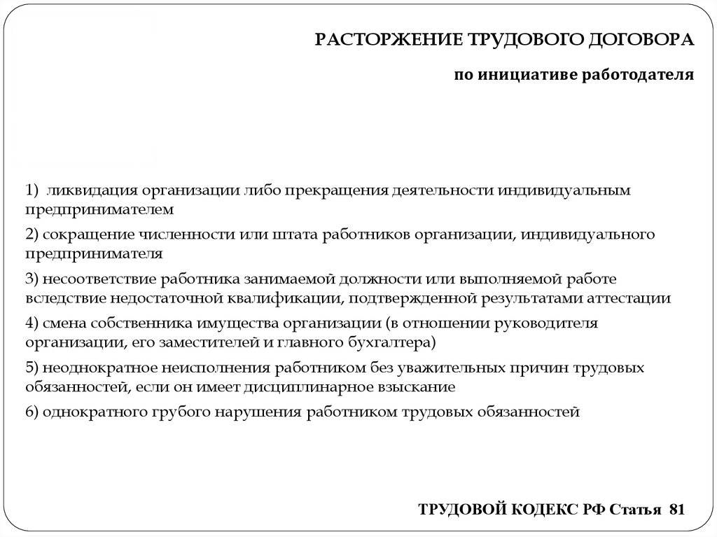 В случае сокращения штата или ликвидации компании увольнение работающего пенсионера производится на общих основаниях. Также сотрудник, достигший преклонного возраста, может быть снят с поста по инициативе руководства, если за ним замечены нарушения трудового распорядка и имеют место быть основания, перечисленные в статье 81 ТК РФ.