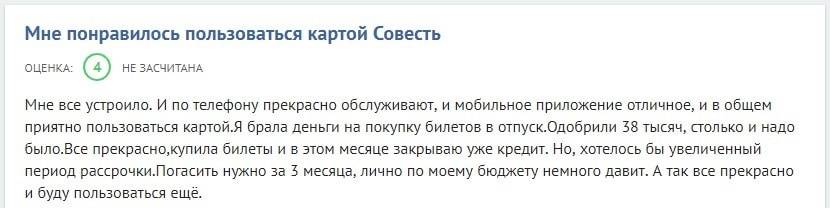 «Я ее приобрела накануне праздников, потому что хотела сделать подарок дочери. Странно, что о банке таком раньше не слышала и офисов не видела. О карте коллега рассказала и показала как оформить. Получила через 2 дня, лимит 35 тысяч, за выдачу ничего не платила. В М Видео её принимают без проблем, специально у кассира спросила. Купила смартфон за 14 тысяч, рассрочка на 4 месяца, внесла только 2 платежа по 3500, платила безналом, без комиссии. Несмотря на некоторые отрицательные отзывы про карту рассрочки Совесть от клиентов, пока ничего не переплатила.»
