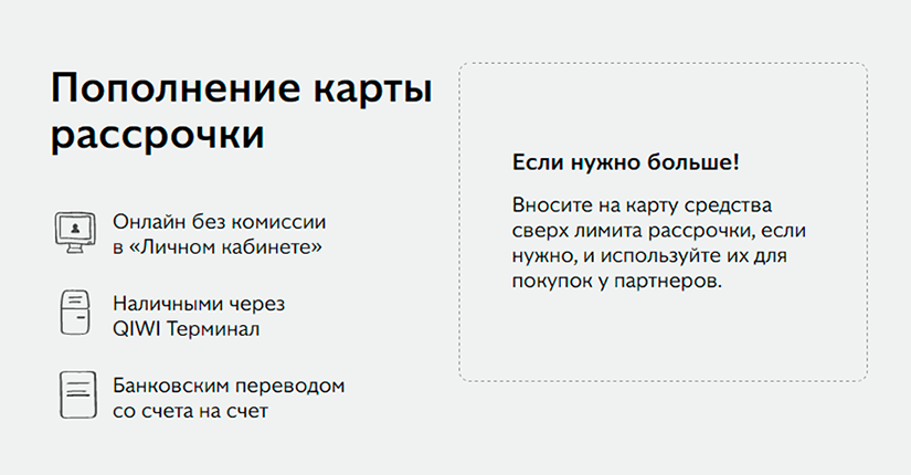 QIWI банк предлагает следующие варианты пополнения карточки рассрочки: