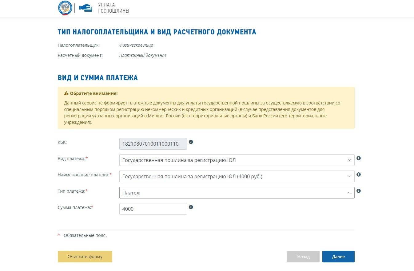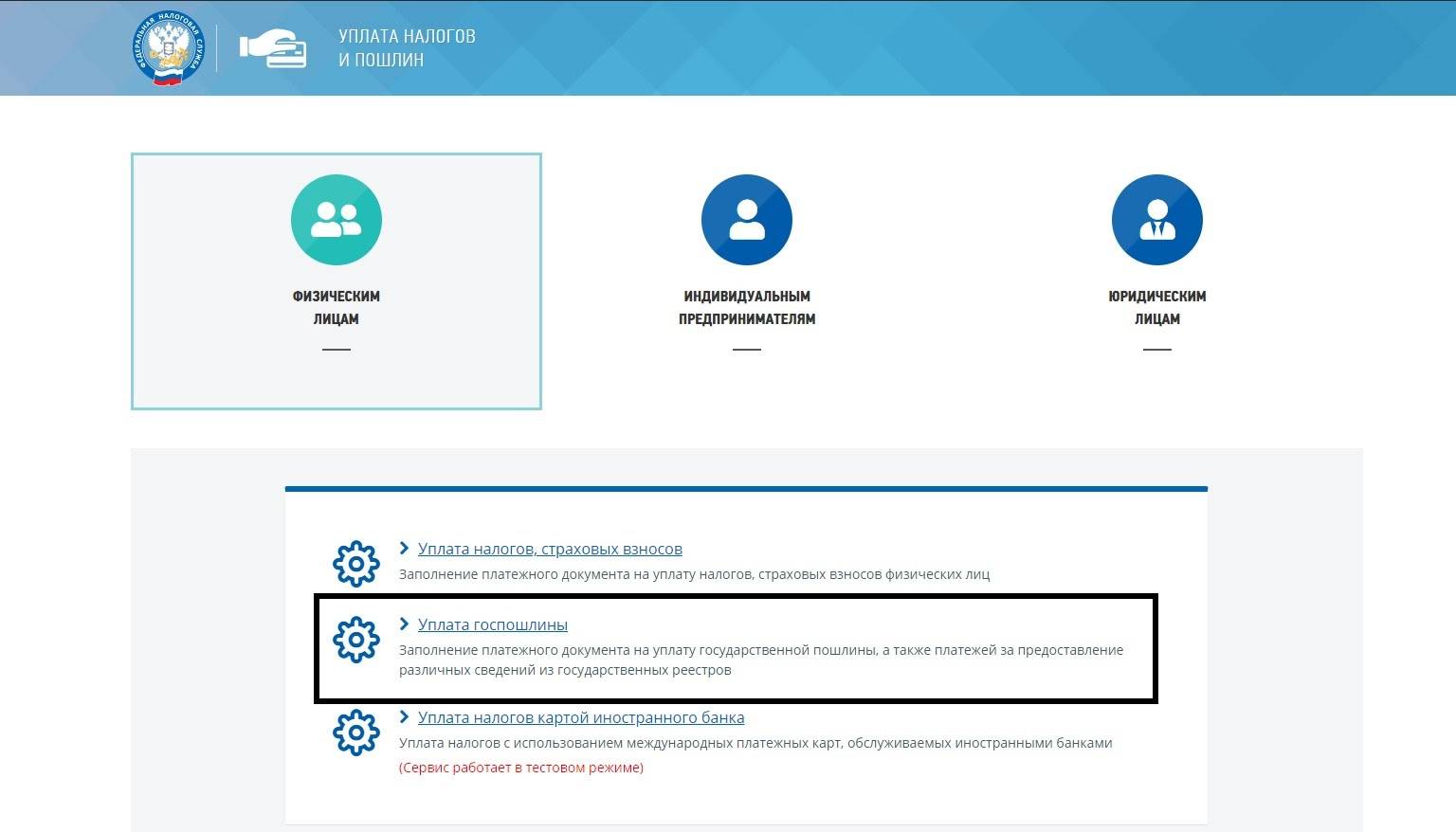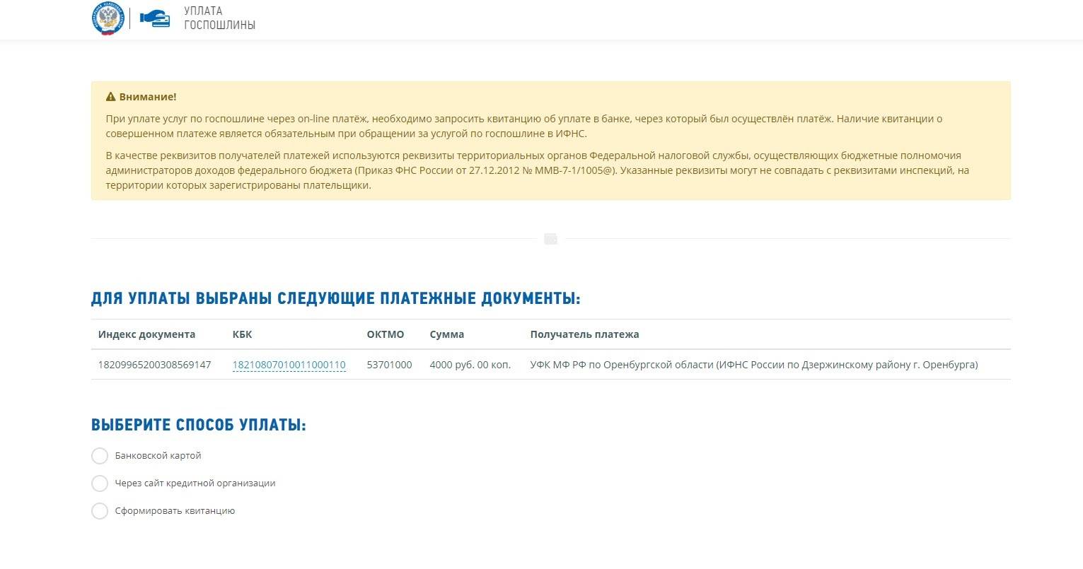 В сервисе «Уплата налогов и госпошлин» не нужна регистрация. Платёжный документ можно сформировать, чтобы распечатать и оплатить в банке или на почте. Также оплатить пошлину можно безналичным способом онлайн .