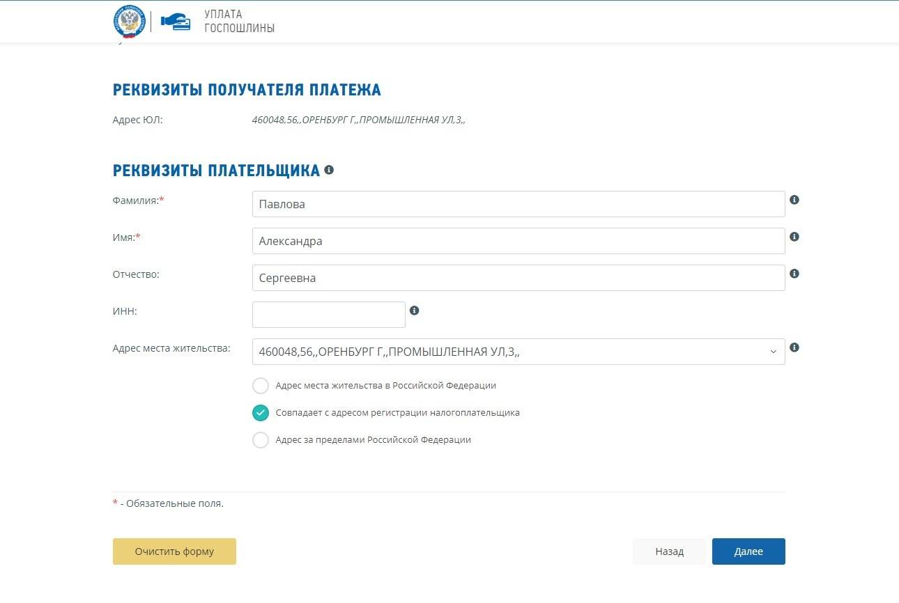 Затем укажите полный адрес юридического лица. После указания сведений в поле «Индекс» поле «Субъект РФ» заполнится автоматически. Нажмите кнопку «Далее» и укажите сведения о плательщике: фамилия и имя — обязательно, ИНН — при наличии. Без ИНН нельзя совершить оплату безналичным способом.