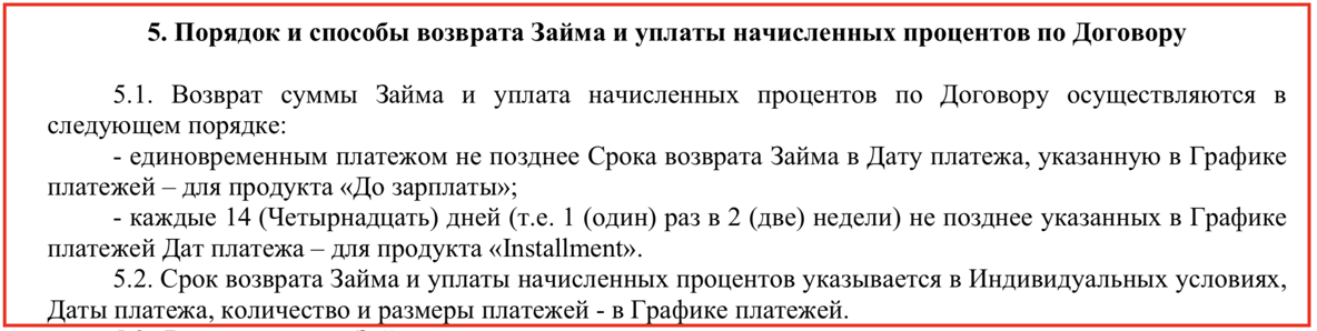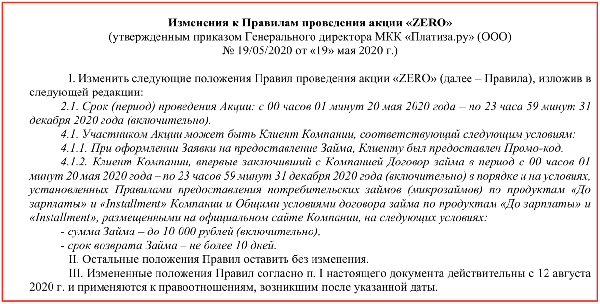 Выдержка из условий договора МКК Платиза.Ру