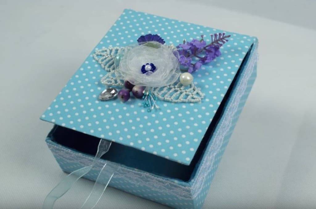 Бока шкатулки можно декорировать красивыми кружевами либо лентами. Крышечку шкатулки стоит украсить цветами и ягодами. В любом случае, декоративные элементы допустимо подобрать по собственному вкусу. Не лишними будут удобные отсеки внутри шкатулочки.