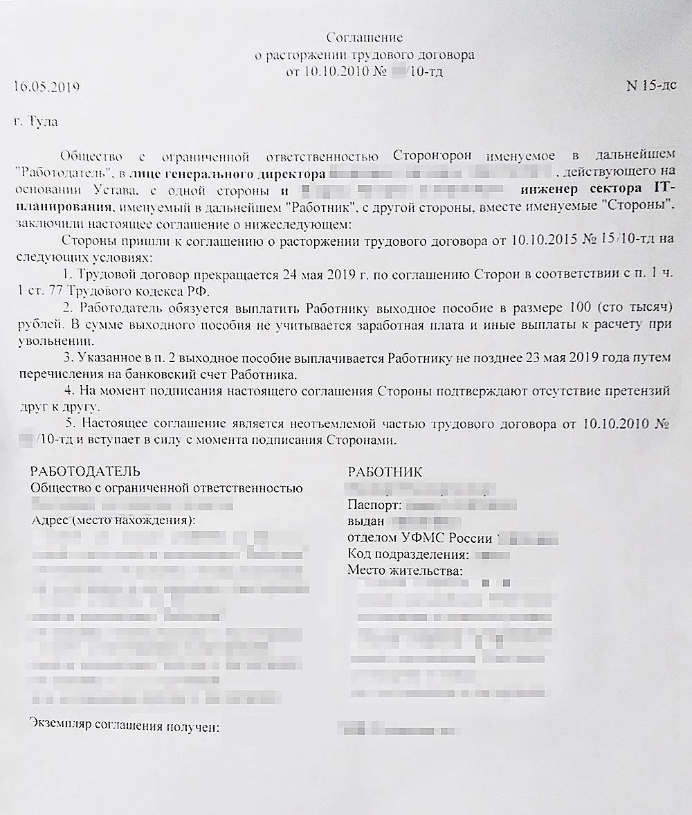 Оговорка про часть трудового договора. В соглашении лучше прямо прописать, что оно является неотъемлемой частью трудового договора. Закон позволяет установить выходное пособие в трудовом или коллективном договоре, а соглашение о прекращении трудового договора — формально другой документ. Оговорка в случае спора защитит работника от аргумента работодателя, что по соглашению выходное пособие не положено.