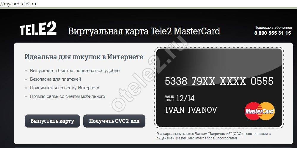 Виртуальная карта Tele2 Mastercard создана оператором Теле2 в сотрудничестве с банком «Таврический». Само название говорит, что использовать её можно для оплаты товаров и услуг только в онлайн-магазинах и онлайн-сервисах. Эта карта не имеет какого-то материального выражения (то есть нет никакого куска пластика, который был бы привязан к счёту), но многие другие атрибуты карты у неё есть – так называемый код CVC, срок действия, номер, прочие реквизиты. Стоит, кстати, отметить, что владельцу запоминать длинные комбинации цифр не придётся, ведь основа номера карты – это номер мобильного. Кроме того, карта строго привязана к балансу телефона, и именно этими финансами можно распоряжаться с её помощью — никакого отдельного счёта не существует.