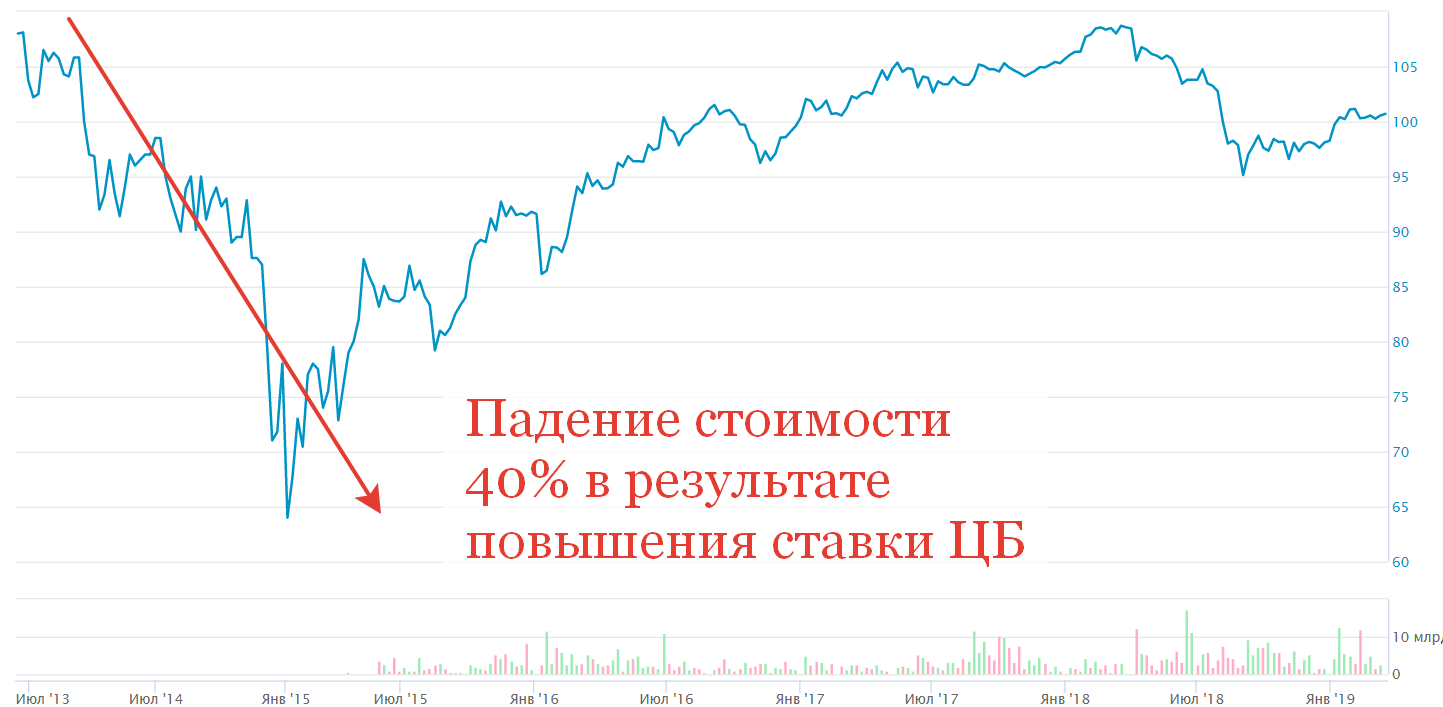 Позже, по мере уменьшения ставки ЦБ, котировки понемногу восстанавливались. Но на это ушли годы.