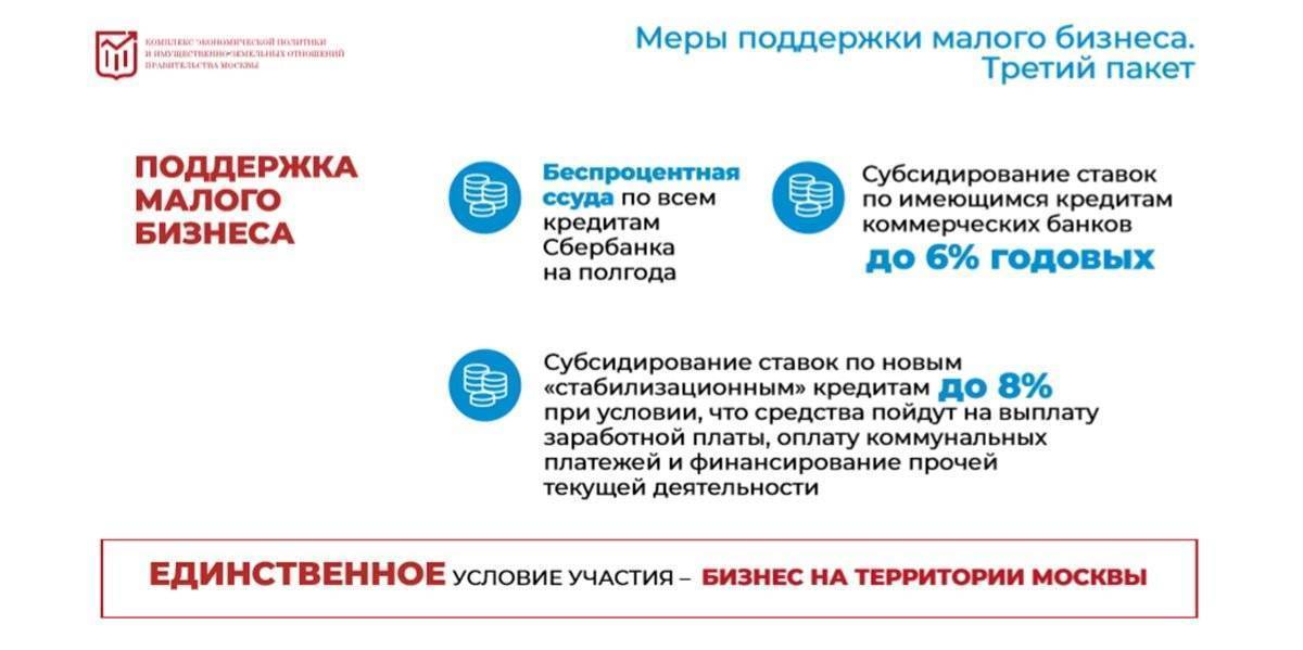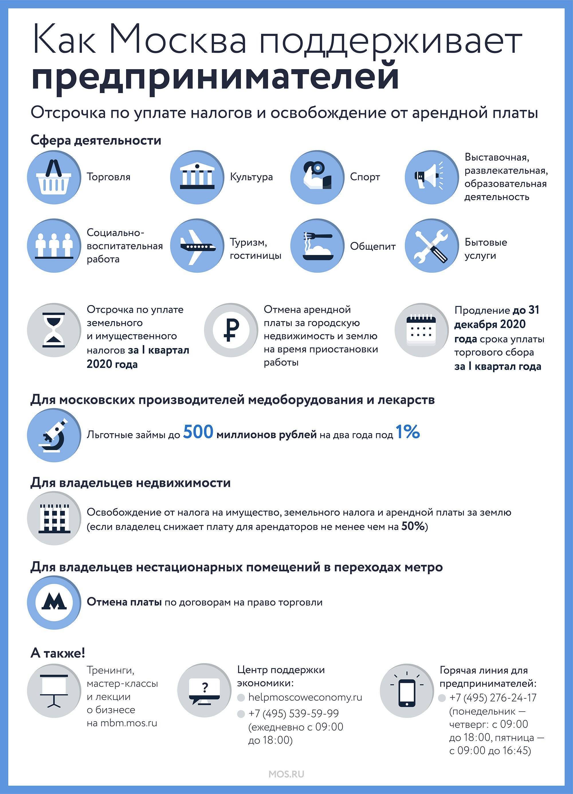Подробную информацию о действующих мерах финансовой поддержки малого и среднего бизнеса также можно получить в специальном разделе на портале «Московский предприниматель».