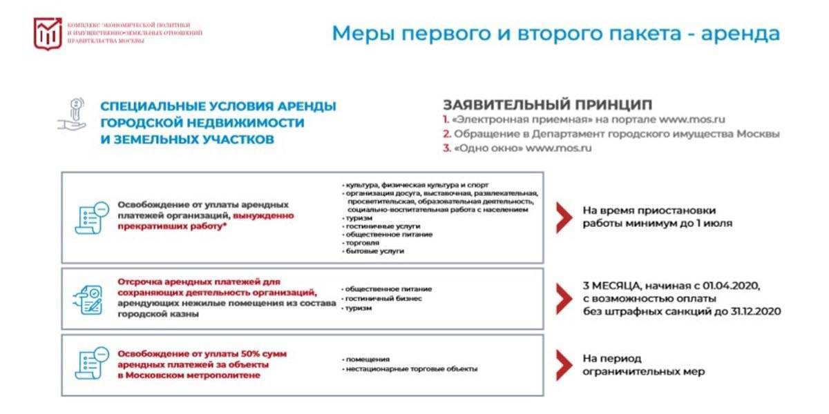 От платежей по аренде городских земельных участков и недвижимости дополнительно освободили предприятия торговли, туризма, общественного питания, бытовых услуг и гостиничного бизнеса, которые приостановили свою деятельность. Освобождение будет действовать с первого числа месяца прекращения работы до 1 июля 2020 года. Чтобы получить эту льготу, нужно обратиться в Департамент городского имущества.