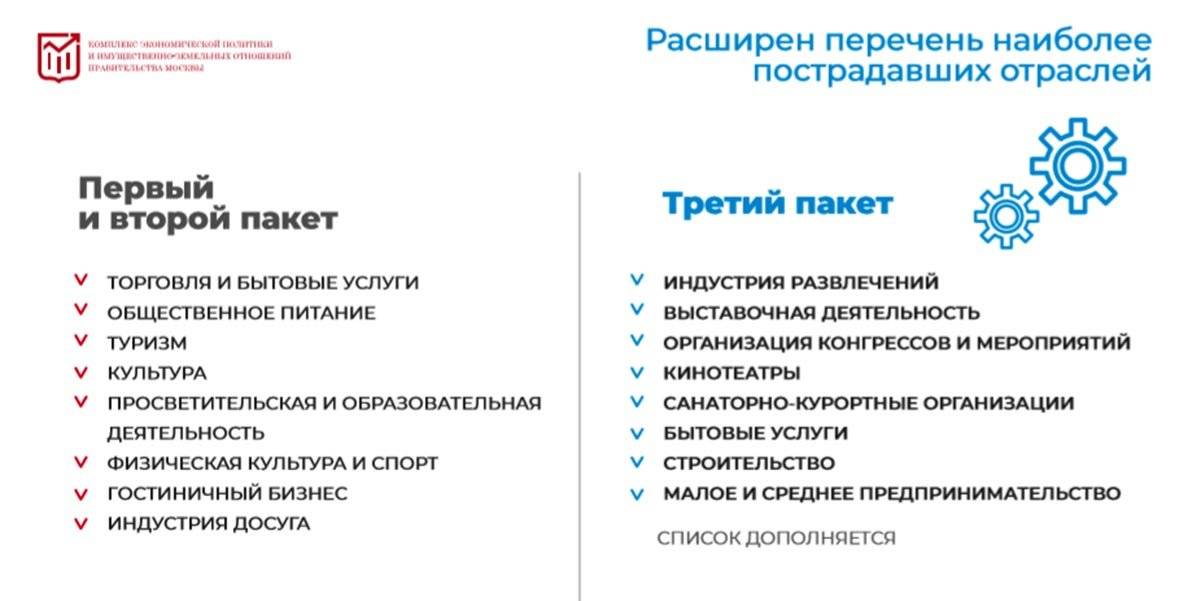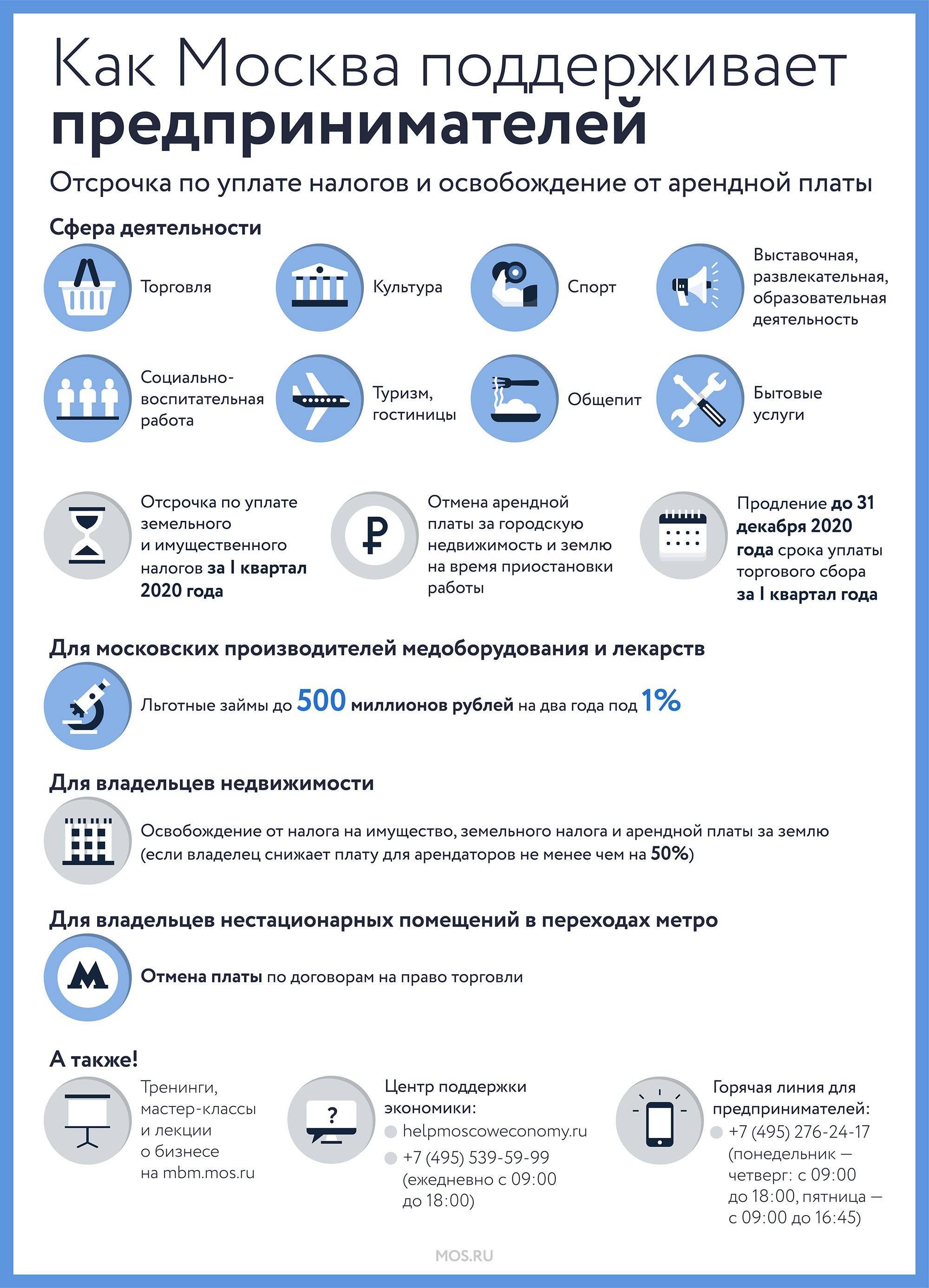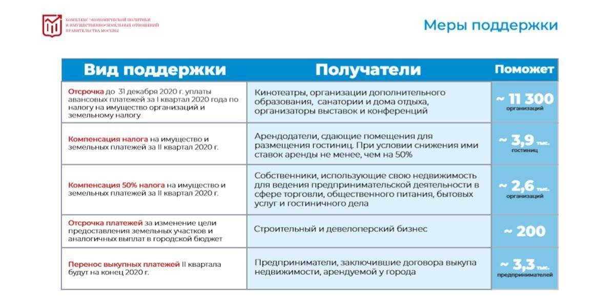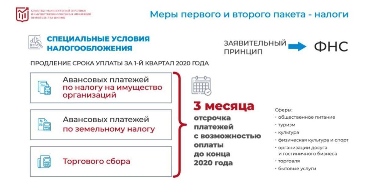 24 марта столичные власти утвердили первый пакет мер поддержки бизнеса. Так, до 31 декабря продлили срок уплаты торгового сбора за первый квартал 2020 года. На этот же срок продлили уплату авансовых платежей за первый квартал 2020 года по налогу на имущество и земельному налогу для организаций, работающих в сфере общественного питания, туризма, культуры, спорта, досуга и гостиничного бизнеса. Именно компании, занятые в этих отраслях, больше всего пострадали в сложившейся ситуации.