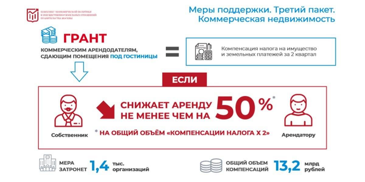 Для того чтобы получить грант, собственнику необходимо снизить своим арендаторам арендную плату за второй квартал на двукратный размер компенсации, но не менее чем на 50 процентов от первоначальной ставки аренды.