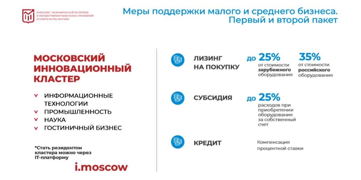 Во втором пакете мер расширен список получателей субсидии на инжиниринг — теперь она доступна участникам Московского инновационного кластера, которые зарегистрировались в качестве юридического лица или индивидуального предпринимателя не менее чем за год до подачи заявки. Ранее этот срок составлял три года.