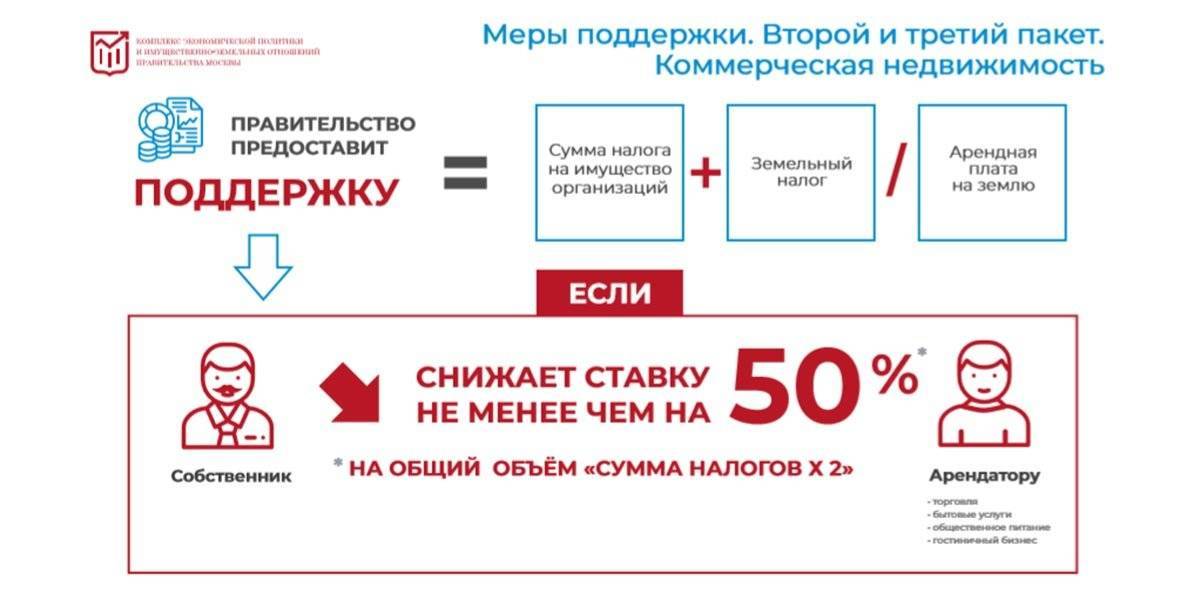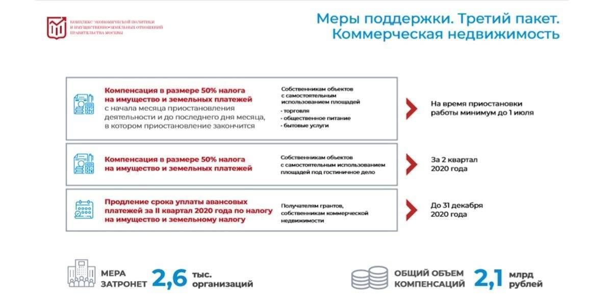 Кроме того, в рамках третьего пакета мер поддержки аналогичный инструмент был разработан и для тех собственников коммерческой недвижимости, которые не сдают площади в аренду, а используют их самостоятельно. В этом случае город компенсирует 50 процентов налога на имущество и земельных платежей за весь период приостановки работы предприятия.