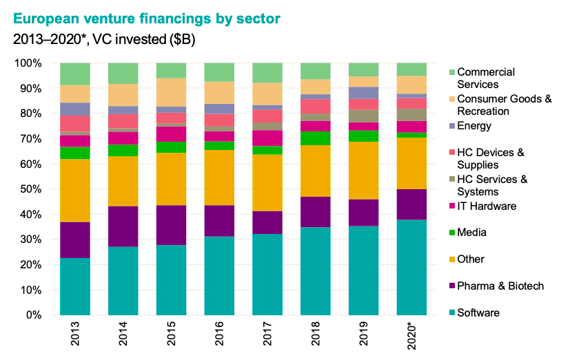 Объем венчурных инвестиций в Европе по отрасли в 2013-2020, исследование KPMG