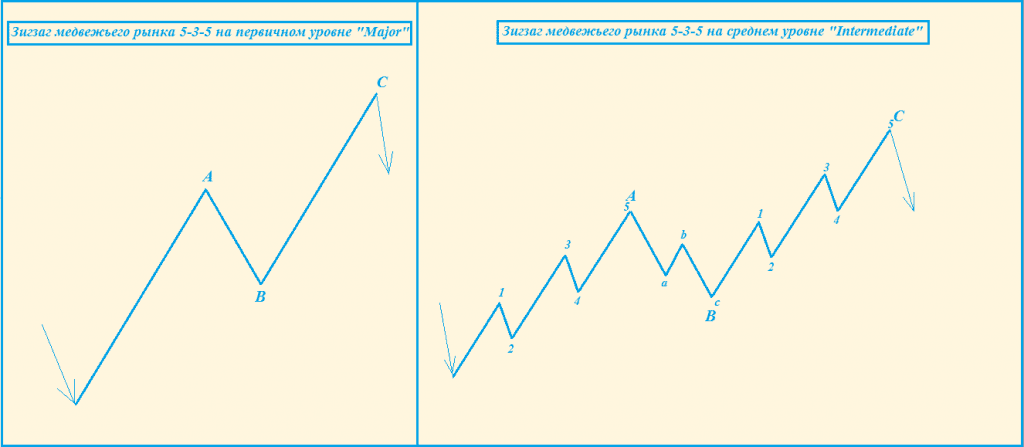 Если рассматривать второй случай, когда рынок принадлежит медведям, то рыночная ситуация будет зеркальным отображением бычьей структуры: