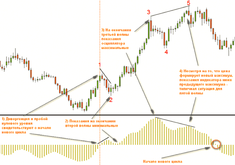 При пересечении гистограммой нулевой отметки в направлении снизу или сверху будет появляться дивергенция, которая сигнализирует об окончании очередной волновой структуры.