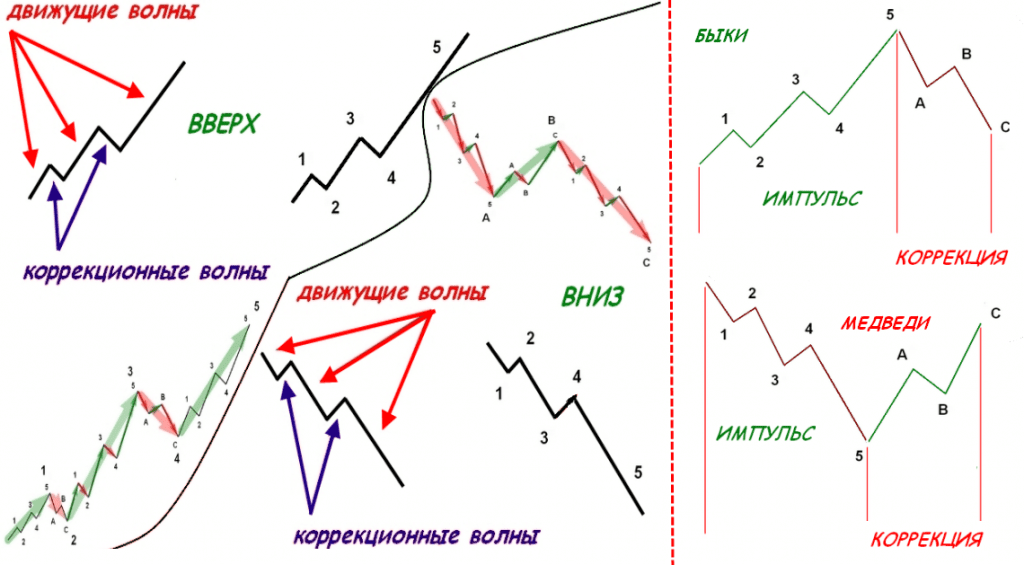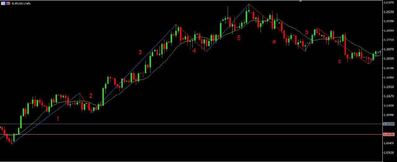 - Импульсные. Они формируют направленное ценовое движение. На рисунке они представлены 1, 3, 5, А, С.