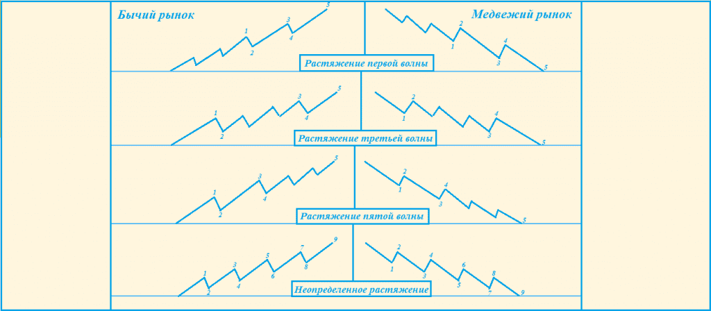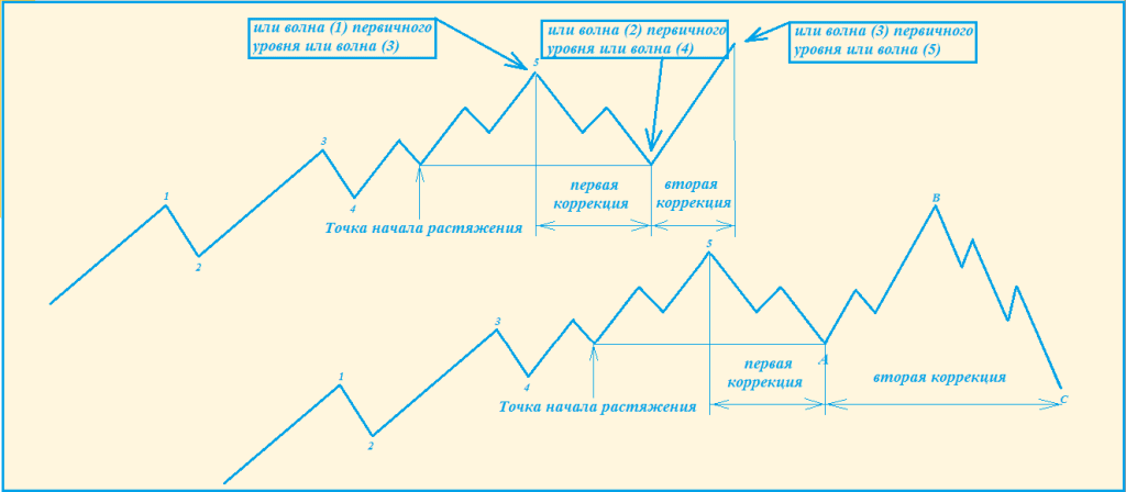 - Растяжение (расширение) волн. Анализируя волны Эллиотта можно найти паттерны, когда одна из волн импульса состоит из более мелких подволн – это явление называется растяжением волны.