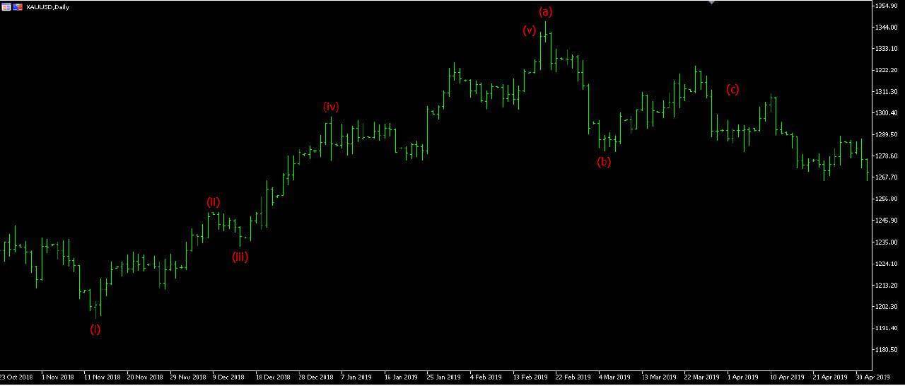 На графике ниже 5 волн, представлены цифрами 1-5. Тогда как три волны, стремящихся против тренда, представлены в качестве A, B, C. Также создатель этой теории, разделяет волны на 2 категории.