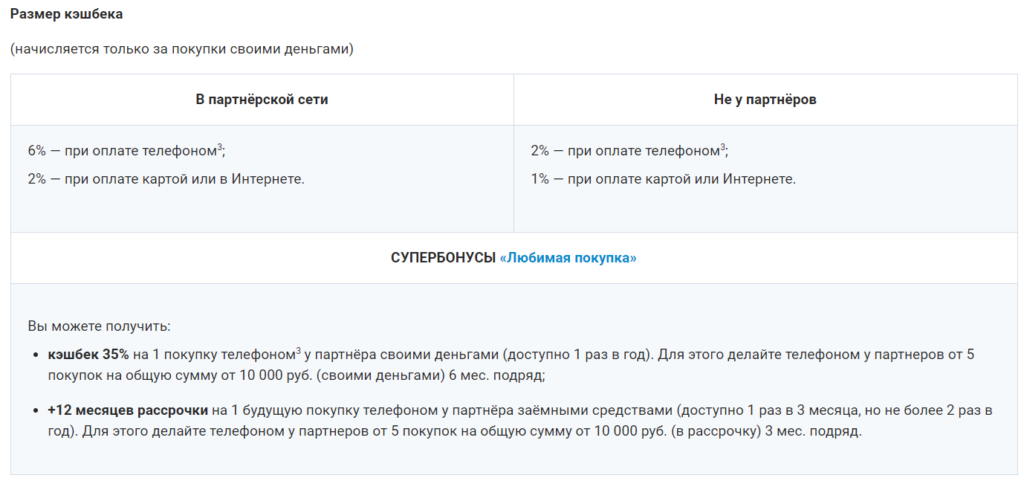 - 10% кэшбэк за покупки у партнеров – начисляется при условии траты личных средств от 50 тыс. и оплаты с телефона;