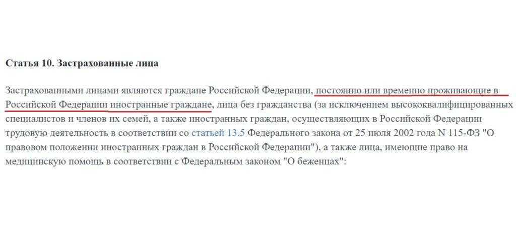 Как отмечалось выше, иностранные граждане с РВП имеют такие же права на оформление ОМС, как и россияне. Об этом говорится в Федеральном законе N 326-ФЗ «Об обязательном медицинском страховании в РФ»: