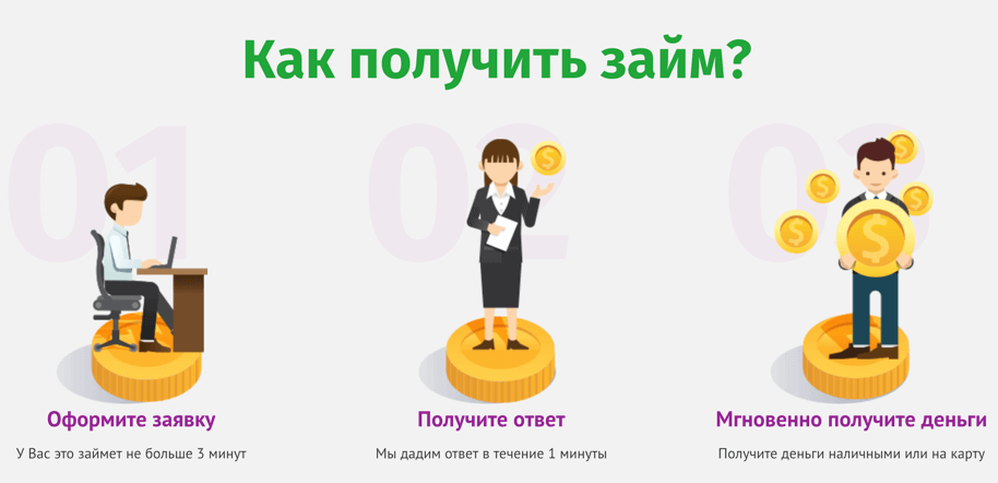 Как же происходит само оформление кредита в микрофинансовой организации? После того, как вы определились с нужной суммой и сроком займа, заполняете онлайн-анкету на сайте, дожидаетесь решения по заявке 1 минуту, а затем – выбираете подходящий способ получения.